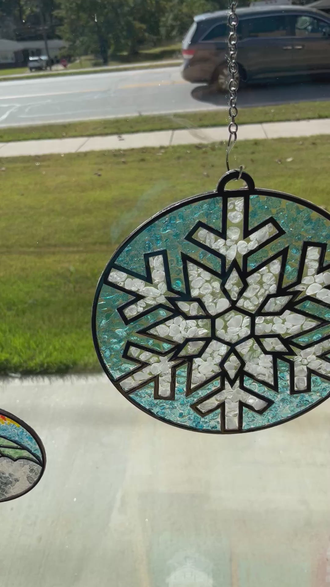 - suction cup, chain and hooks for hanging in a window.