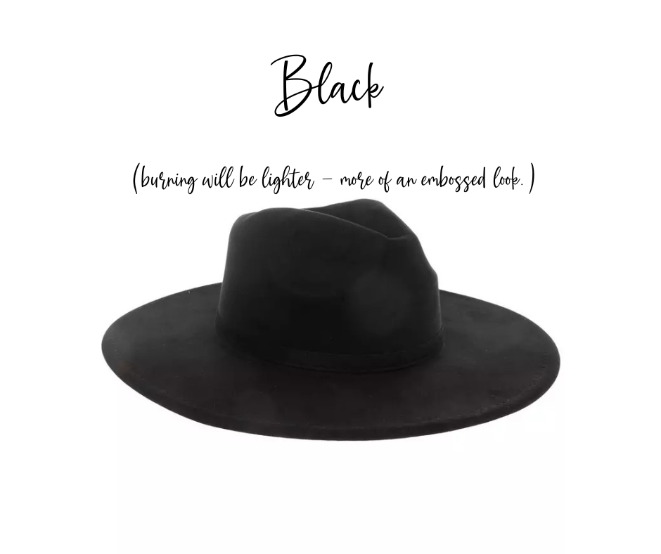 Choose from a wide brim style hat, baseball cap or boho bag. Each one is a vegan suede material that burns beautifully.